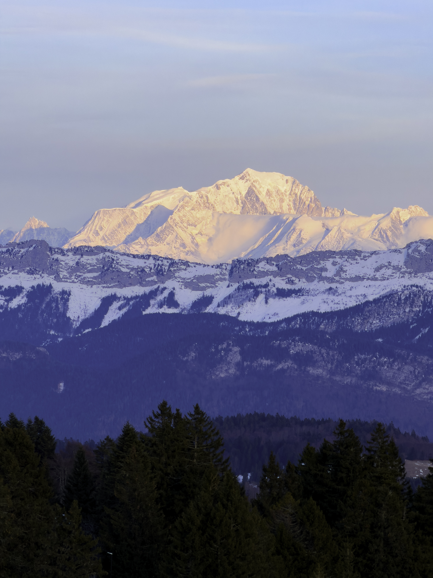 Perché au-dessus de Chambéry, le belvédère du Revard est sans doute le site le plus emblématique du territoire. Ici, le regard embrasse un paysage d’une ampleur saisissante : le lac du Bourget s’étire en contrebas, les reliefs de la Chartreuse et des Bauges tracent leurs estampes poétiques, et la silhouette du Mont Blanc se détache au-dessus des Aravis, comme un hologramme pâle que le couchant rosit.